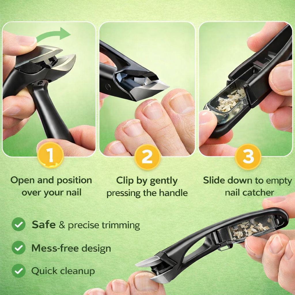 Simply open the clipper, position the angled head over your nail, and gently press the handle to trim. The nail catcher collects the clippings so you can clean up in seconds. Safe, fast, and effortless.