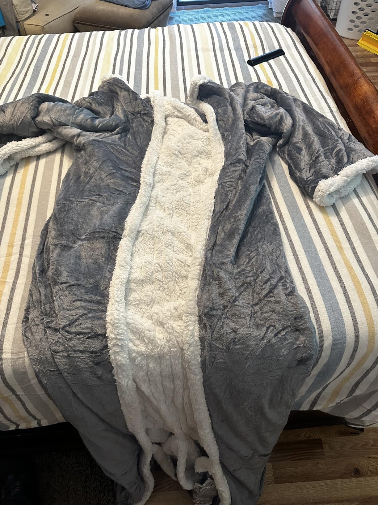 This wearable blanket is as described and huge! It's made well with soft and cozy material. It works well and comes with easy directions. Only thing is that is has a strong chemical type odor that hasn't gone away yet. I have t washed it yet to see how it does in that aspect.